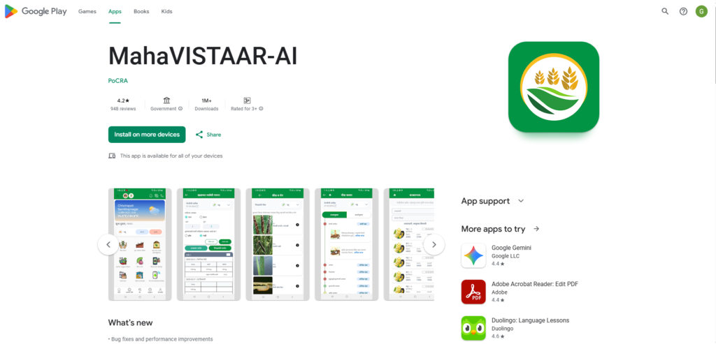 MahaVISTAAR-AI हे महाराष्ट्र शासनाच्या कृषी विभागामार्फत शेतकऱ्यांसाठी सुरू करण्यात आलेले एक उपयुक्त मोबाईल अॅप आहे.